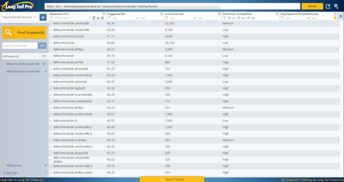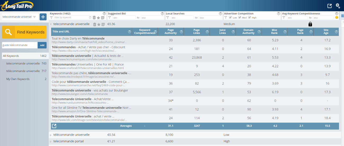 J’utilise donc un outil appelé « Long Tail Pro » qui permet d’obtenir les différents mots clés relatifs à l’expression « télécommande universelle ». Si vous n’avez pas cet outil (payant) ne paniquez pas, vous pouvez vous en sortir et obtenir les mêmes informations différemment.